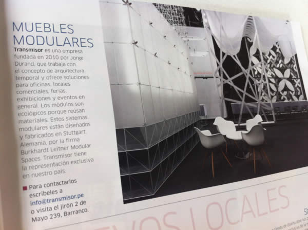 La revista de arquitectura, diseño y decoración CASAS Y MAS, en su número 30, incluyó una nota de TRANSMISOR destacando su servicio de Arquitectura Temporal y el uso de los sistemas modulares burkhardt leitner modular spaces. La foto corresponde al stand de la mencionada empresa alemana instalado en la última versión del EUROSHOP (Dusseldorf, Alemania) en el que TRANSMISOR participo como co-expositor.